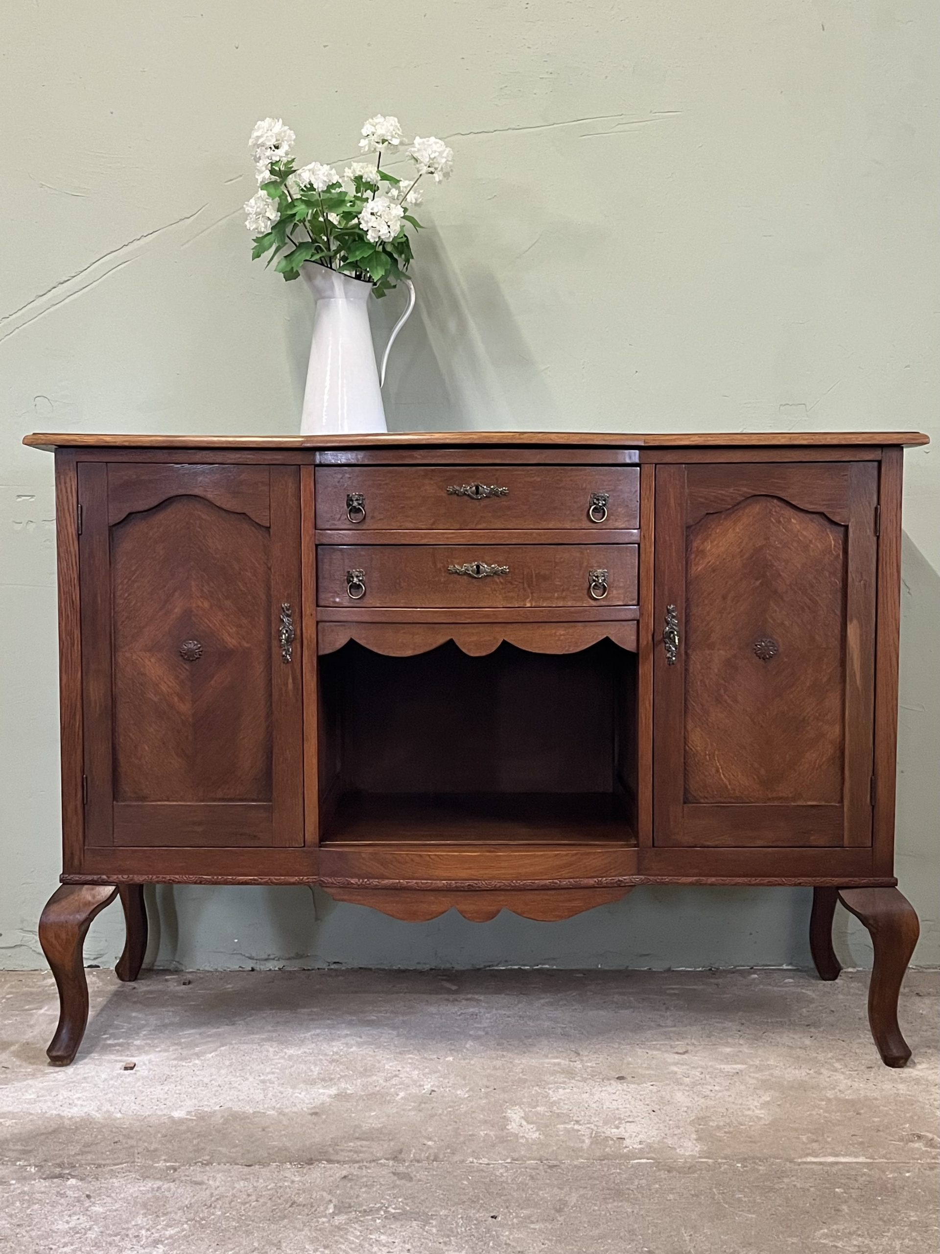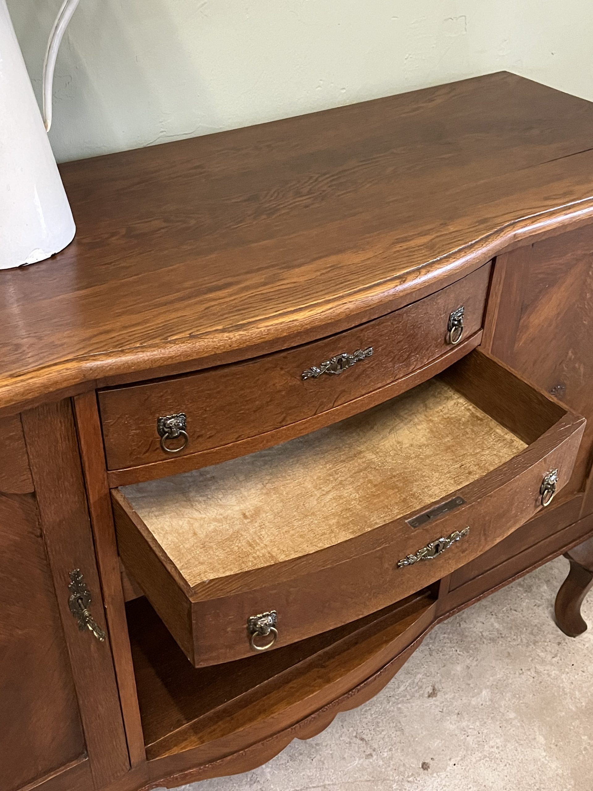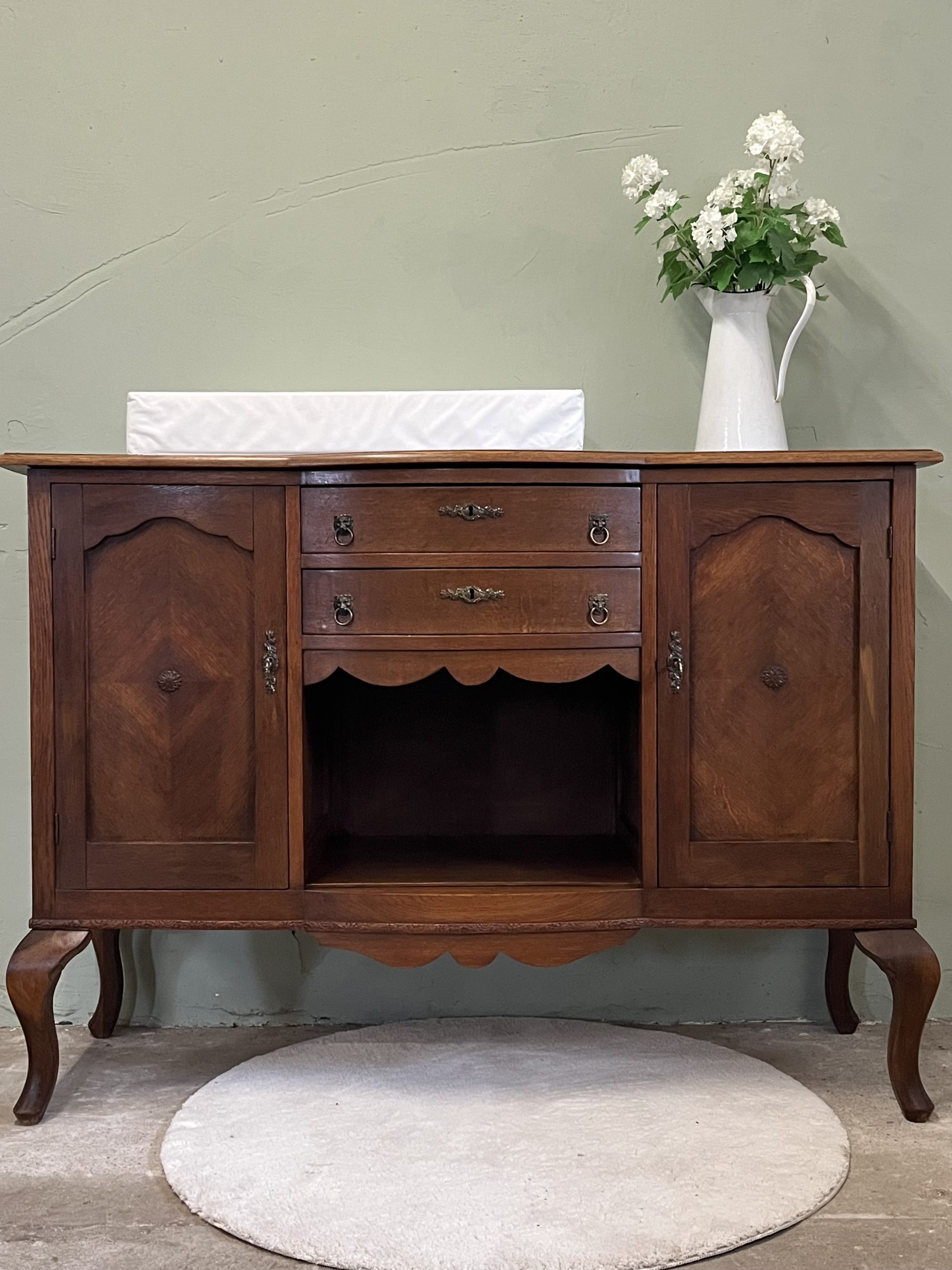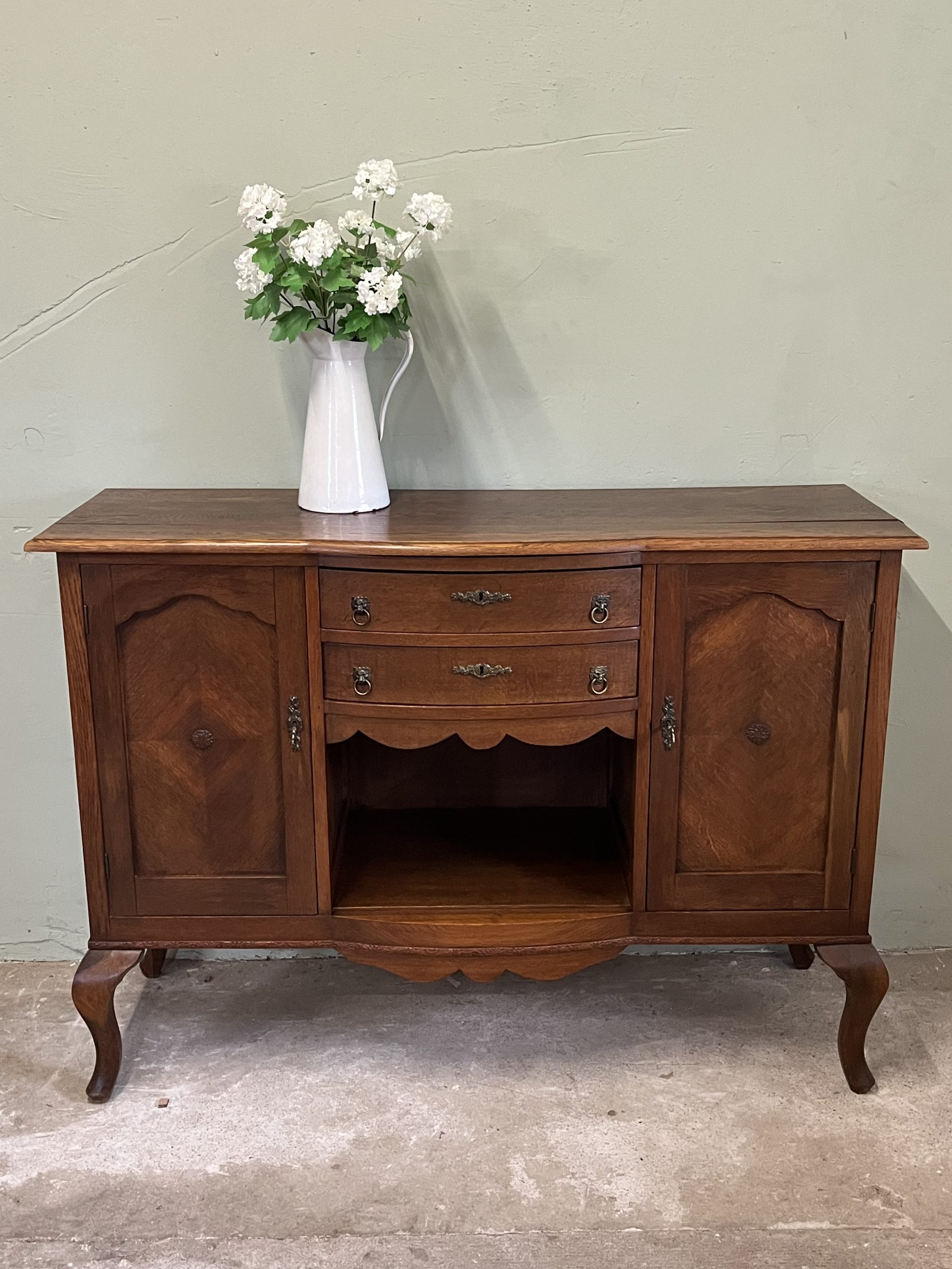 De twee deurtjes met verfijnd paneelwerk en het mooie houtpatroon vertellen een verhaal van vroeger. De lades met hun originele handgrepen zorgen voor nét dat beetje extra charme.